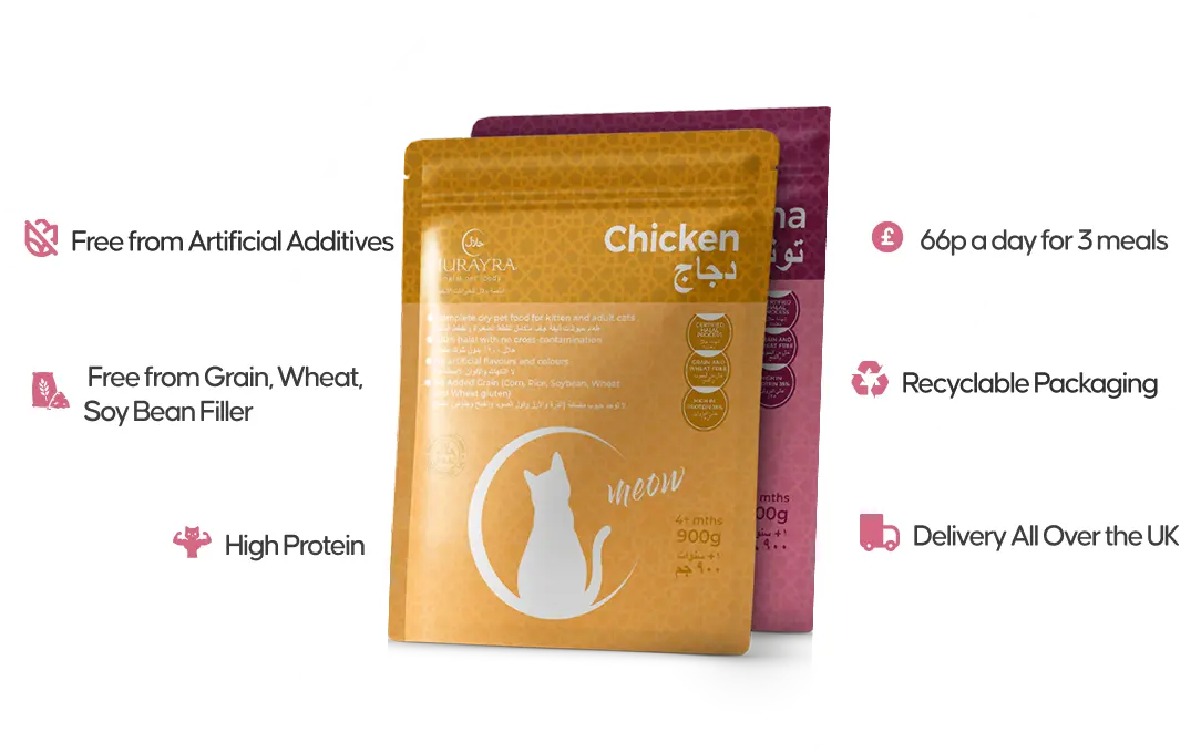 Hurayra uses real, human-grade Halal meat with no artificial additives, grains, wheat, or soy. Each recipe includes 35% protein, Omegas 3-6-9, and essential vitamins for daily wellbeing.