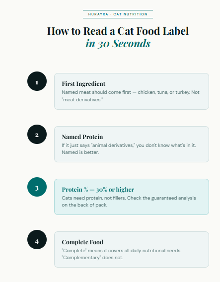 For owners who want to understand what their cat is eating, the most useful habit is checking the first three ingredients. In a high-quality dry food, the first ingredient should be a named animal protein (not “meat derivatives” or “animal by-products”), the declared protein percentage should be visible on the pack, and the formulation should state whether it is a complete food or a complementary one.
