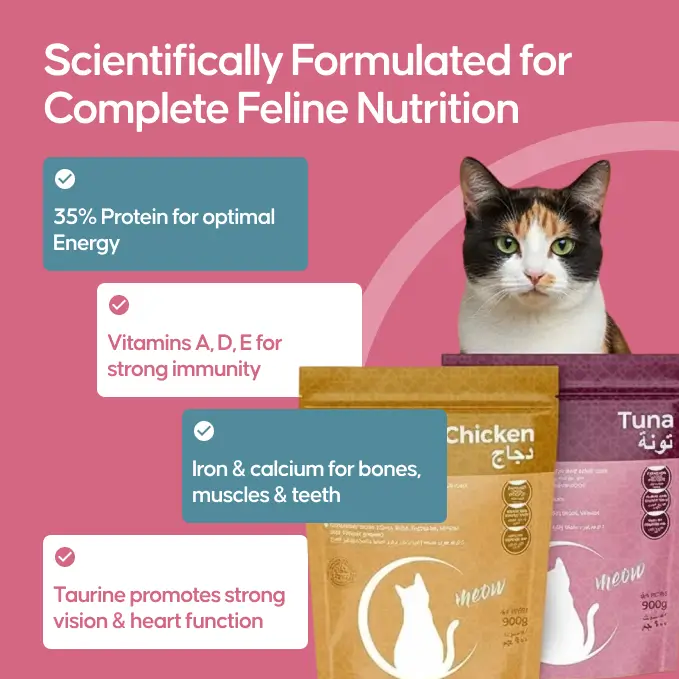 - Contains essential Taurine (in Chicken variety), vital for feline cardiac function and vision.