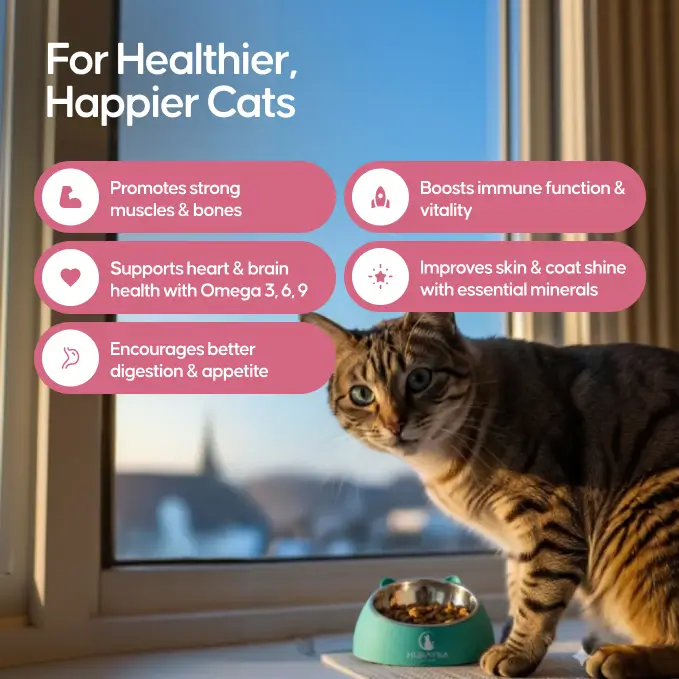 - Edible Fibre (Cellulose) aids in hairball control and healthy digestion, complemented by Yeast Extract and Oligosaccharide for gut balance.