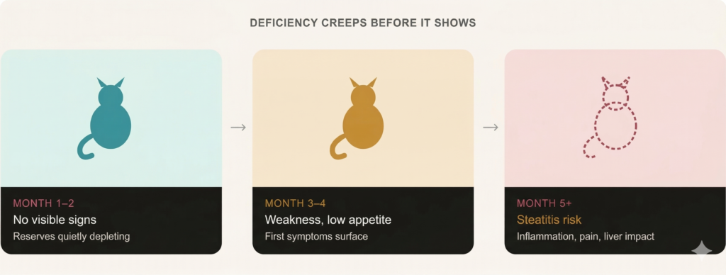 This is the part most people are not aware of. Compared to dogs, cats are meaningfully more vulnerable to vitamin E shortfall, and the reason is directly tied to how many of them are fed.