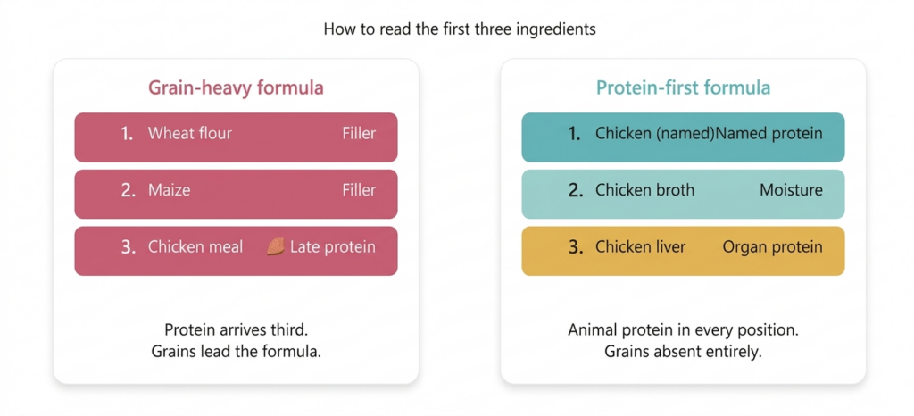 Start with the first three ingredients. These are the largest components by weight before cooking. Named animal proteins in positions one and two are a clear positive signal.