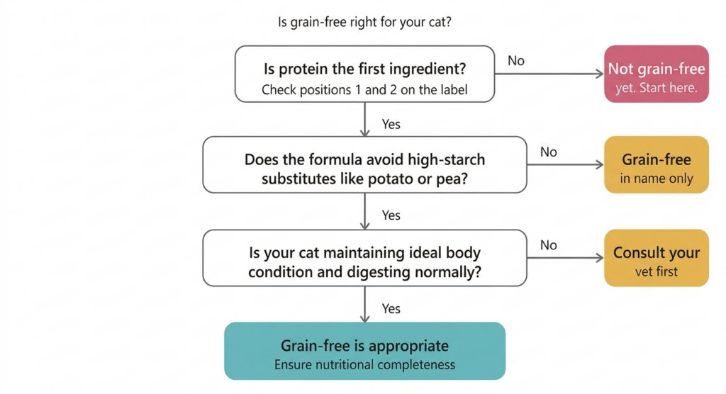 No. Grain-free cat food is a starting point, not a quality guarantee. A formula substituting high-starch alternatives like pea starch may not represent a meaningful improvement. Check what replaced the grain.
