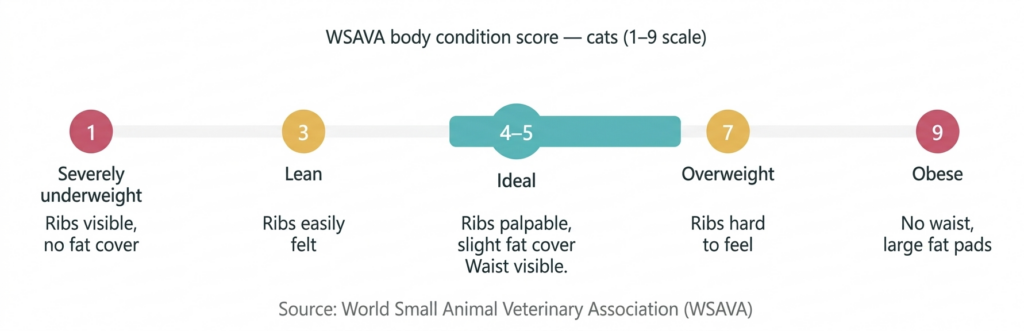 Use body condition scoring as an objective measure. The WSAVA scale runs from 1 to 9. Scores of 4 to 5 indicate ideal conditions. If your cat maintains that range on its current diet with no digestive irregularity, that data is worth keeping in mind before making changes.
